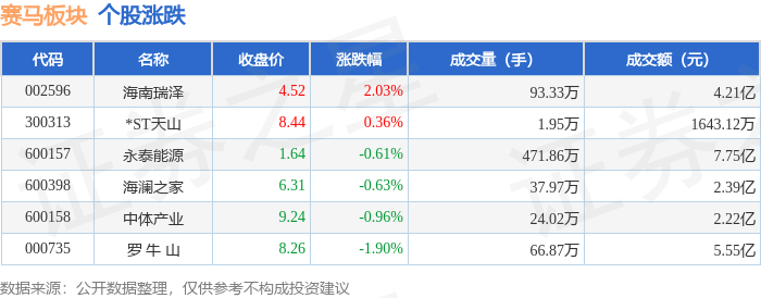 证券之星消息,11月11日赛马板块较上一交易日下跌0.59%,罗 牛 山领跌。当日上证指数报收于4002.76,下跌0.39%。深证成指报收于13289.0,下跌1.03%。赛马板块个股涨跌见下表: