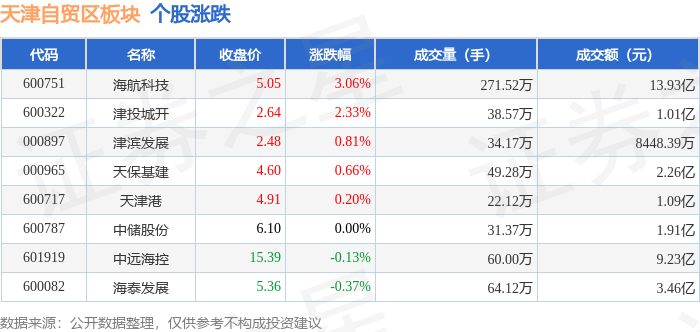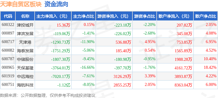 从资金流向上来看,当日天津自贸区板块主力资金净流出2.7亿元,游资资金净流入5675.94万元,散户资金净流入2.13亿元。天津自贸区板块个股资金流向见下表: