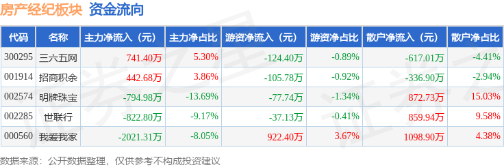 从资金流向上来看,当日房产经纪板块主力资金净流出2455.0万元,游资资金净流入577.34万元,散户资金净流入1877.66万元。房产经纪板块个股资金流向见下表: