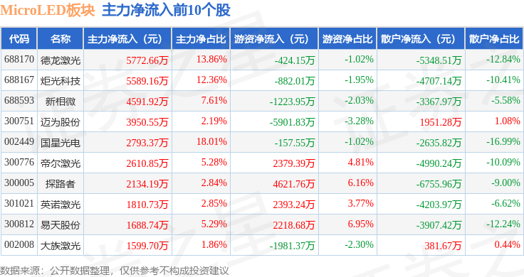 从资金流向上来看,当日MicroLED板块主力资金净流出4.08亿元,游资资金净流入5.75亿元,散户资金净流出1.67亿元。MicroLED板块个股资金流向见下表: