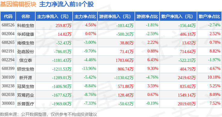 从资金流向上来看,当日基因编辑板块主力资金净流出2.77亿元,游资资金净流入5509.42万元,散户资金净流入2.22亿元。基因编辑板块个股资金流向见下表:
