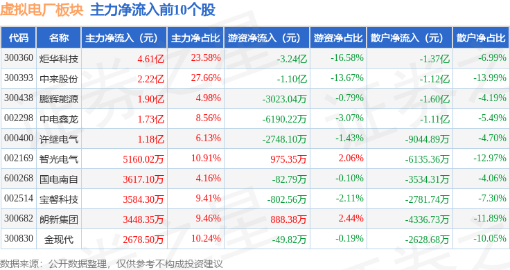 从资金流向上来看,当日虚拟电厂板块主力资金净流出18.95亿元,游资资金净流入2.59亿元,散户资金净流入16.35亿元。虚拟电厂板块个股资金流向见下表:
