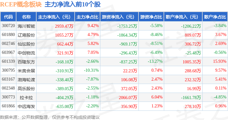 从资金流向上来看,当日RCEP概念板块主力资金净流出2.35亿元,游资资金净流出1070.84万元,散户资金净流入2.46亿元。RCEP概念板块个股资金流向见下表: