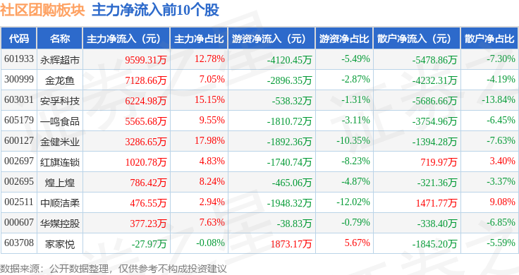 从资金流向上来看,当日社区团购板块主力资金净流出3155.77万元,游资资金净流出9096.9万元,散户资金净流入1.23亿元。社区团购板块个股资金流向见下表: