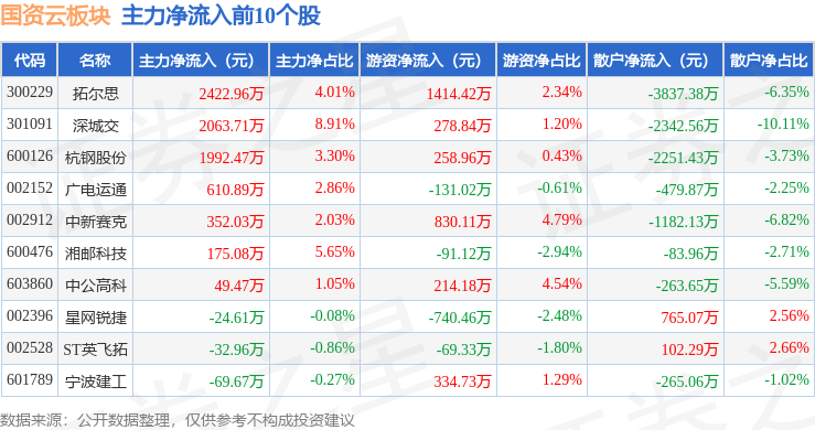 从资金流向上来看,当日国资云板块主力资金净流出19.79亿元,游资资金净流入5.73亿元,散户资金净流入14.06亿元。国资云板块个股资金流向见下表: