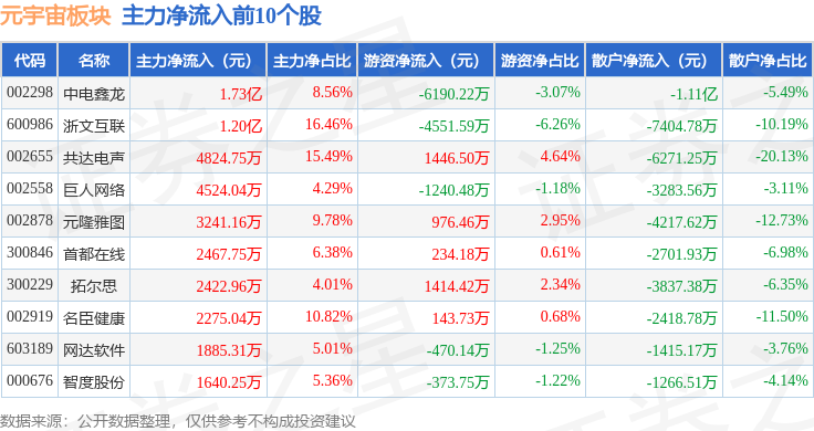从资金流向上来看,当日元宇宙板块主力资金净流出49.69亿元,游资资金净流入8.86亿元,散户资金净流入40.84亿元。元宇宙板块个股资金流向见下表: