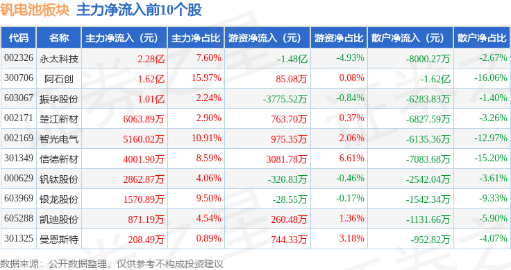 从资金流向上来看,当日钒电池板块主力资金净流出8318.95万元,游资资金净流入1.11亿元,散户资金净流出2769.8万元。钒电池板块个股资金流向见下表: