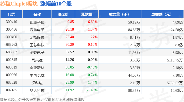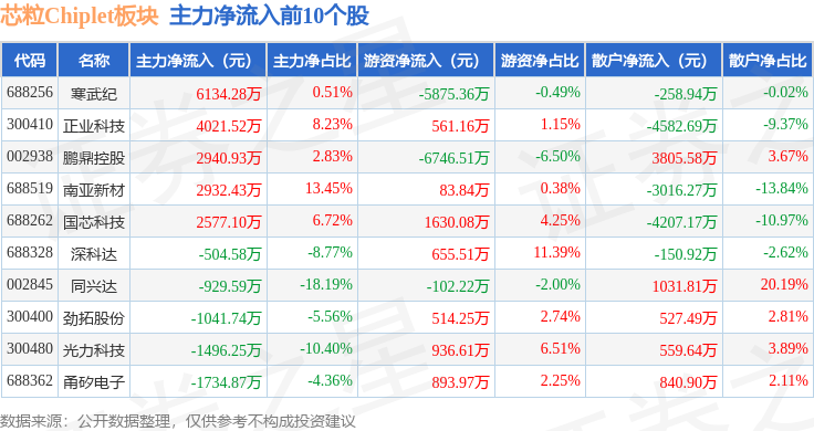 从资金流向上来看,当日芯粒Chiplet板块主力资金净流出11.55亿元,游资资金净流入5543.64万元,散户资金净流入11.0亿元。芯粒Chiplet板块个股资金流向见下表: