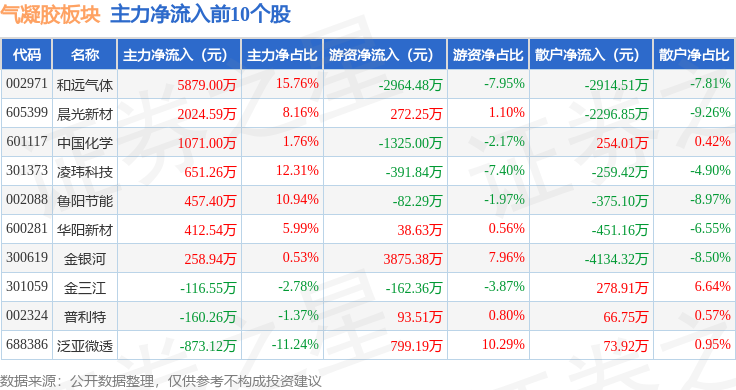 从资金流向上来看,当日气凝胶板块主力资金净流出3.45亿元,游资资金净流入6863.02万元,散户资金净流入2.77亿元。气凝胶板块个股资金流向见下表: