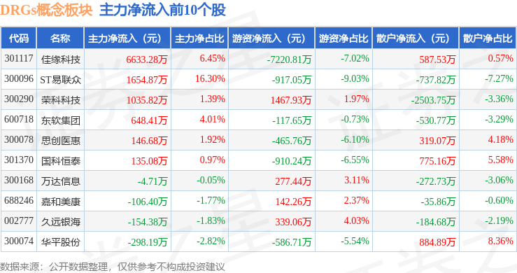 从资金流向上来看,当日DRGs概念板块主力资金净流出8319.36万元,游资资金净流出7894.19万元,散户资金净流入1.62亿元。DRGs概念板块个股资金流向见下表: