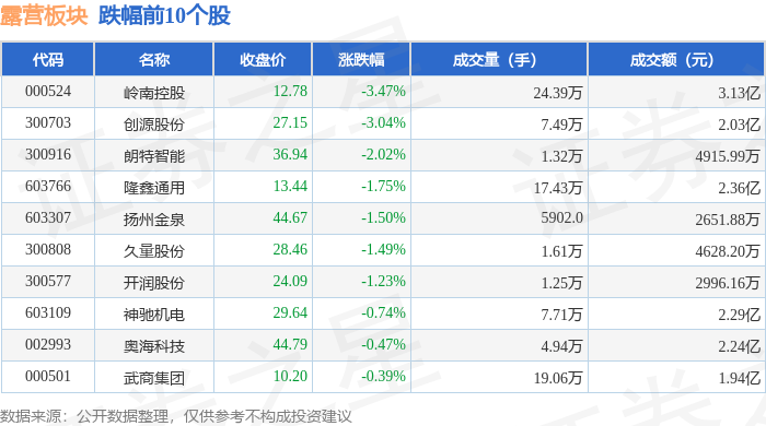 证券之星消息,11月11日露营板块较上一交易日上涨0.49%,探路者领涨。当日上证指数报收于4002.76,下跌0.39%。深证成指报收于13289.0,下跌1.03%。露营板块个股涨跌见下表: