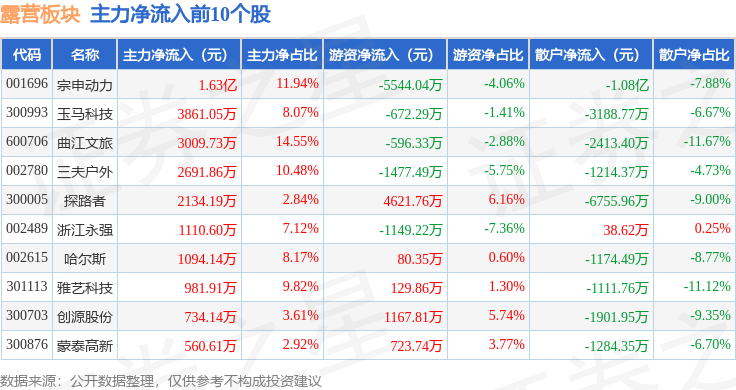 从资金流向上来看,当日露营板块主力资金净流入1.21亿元,游资资金净流入1904.65万元,散户资金净流出1.4亿元。露营板块个股资金流向见下表:
