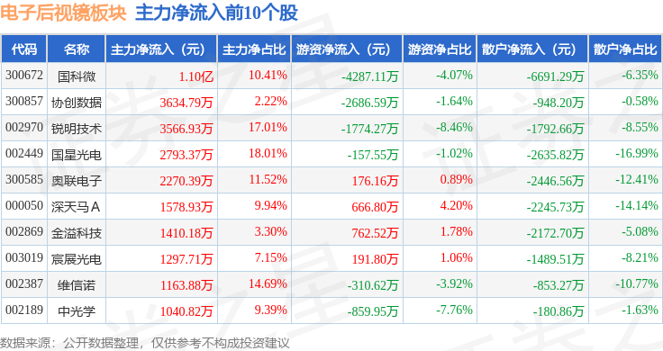 从资金流向上来看,当日电子后视镜板块主力资金净流出11.09亿元,游资资金净流入6.16亿元,散户资金净流入4.93亿元。电子后视镜板块个股资金流向见下表: