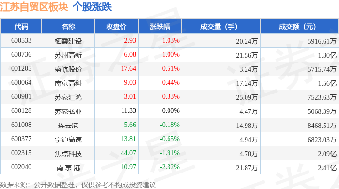 证券之星消息,11月11日江苏自贸区板块较上一交易日下跌0.4%,南 京 港领跌。当日上证指数报收于4002.76,下跌0.39%。深证成指报收于13289.0,下跌1.03%。江苏自贸区板块个股涨跌见下表:
