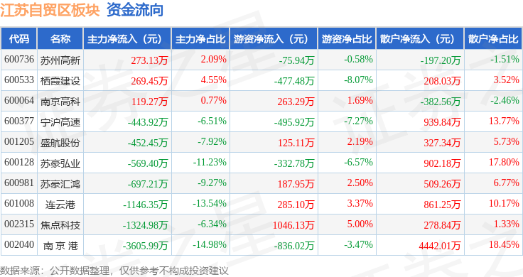 从资金流向上来看,当日江苏自贸区板块主力资金净流出7578.44万元,游资资金净流出310.56万元,散户资金净流入7889.01万元。江苏自贸区板块个股资金流向见下表: