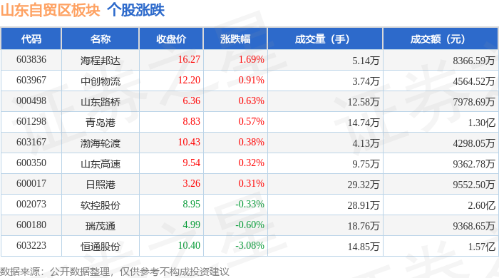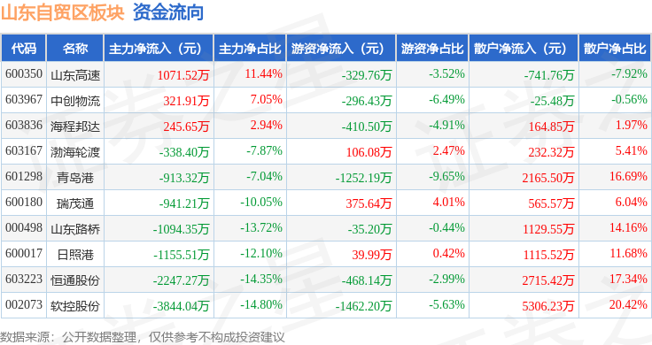 从资金流向上来看,当日山东自贸区板块主力资金净流出8895.01万元,游资资金净流出3732.71万元,散户资金净流入1.26亿元。山东自贸区板块个股资金流向见下表: