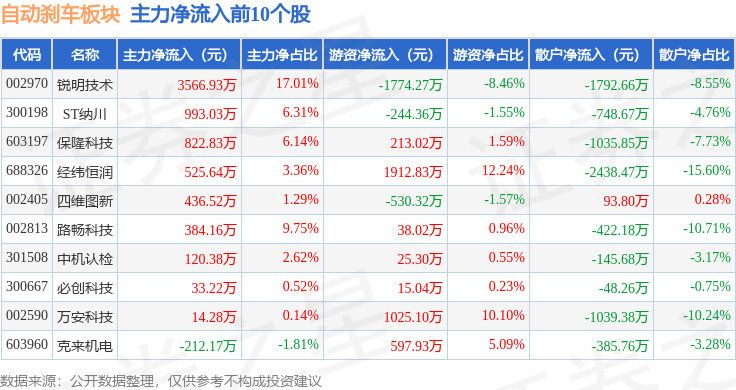 从资金流向上来看,当日自动刹车板块主力资金净流出6.84亿元,游资资金净流入1.07亿元,散户资金净流入5.77亿元。自动刹车板块个股资金流向见下表: