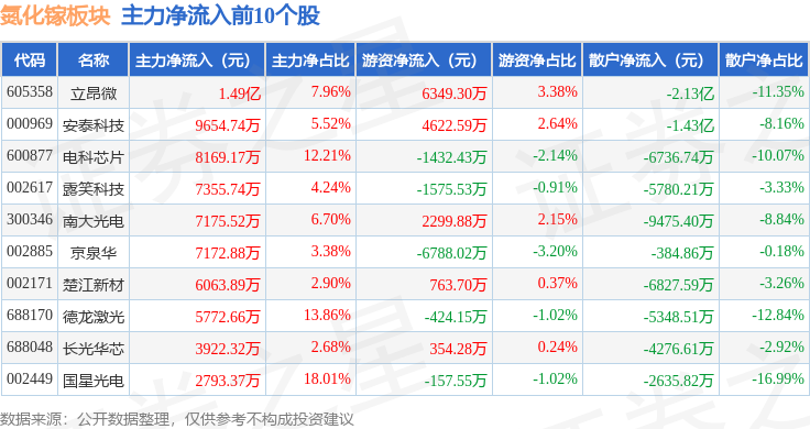 从资金流向上来看,当日氮化镓板块主力资金净流出42.32亿元,游资资金净流入15.12亿元,散户资金净流入27.2亿元。氮化镓板块个股资金流向见下表: