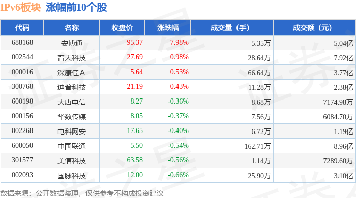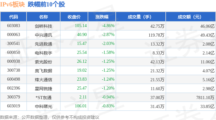 证券之星消息,11月11日IPv6板块较上一交易日下跌1.28%,剑桥科技领跌。当日上证指数报收于4002.76,下跌0.39%。深证成指报收于13289.0,下跌1.03%。IPv6板块个股涨跌见下表:
