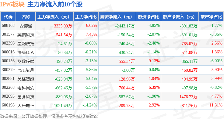 从资金流向上来看,当日IPv6板块主力资金净流出19.96亿元,游资资金净流入9.64亿元,散户资金净流入10.31亿元。IPv6板块个股资金流向见下表: