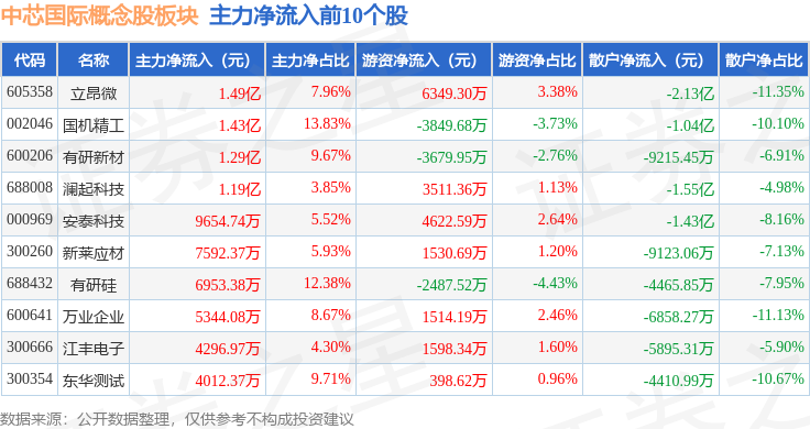 从资金流向上来看,当日中芯国际概念股板块主力资金净流出16.27亿元,游资资金净流入8.65亿元,散户资金净流入7.62亿元。中芯国际概念股板块个股资金流向见下表: