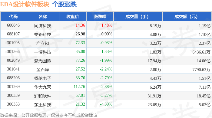 证券之星消息,11月11日EDA设计软件板块较上一交易日下跌2.36%,东土科技领跌。当日上证指数报收于4002.76,下跌0.39%。深证成指报收于13289.0,下跌1.03%。EDA设计软件板块个股涨跌见下表: