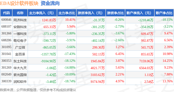 从资金流向上来看,当日EDA设计软件板块主力资金净流出6.97亿元,游资资金净流入1.81亿元,散户资金净流入5.17亿元。EDA设计软件板块个股资金流向见下表: