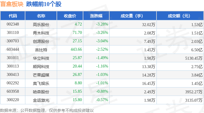 证券之星消息,11月11日盲盒板块较上一交易日下跌0.59%,高乐股份领跌。当日上证指数报收于4002.76,下跌0.39%。深证成指报收于13289.0,下跌1.03%。盲盒板块个股涨跌见下表: