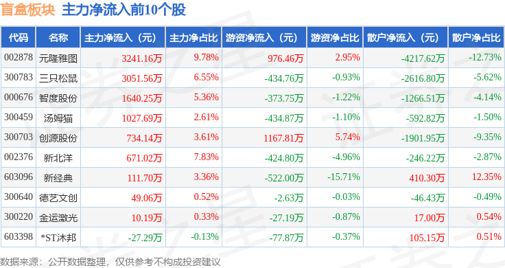 从资金流向上来看,当日盲盒板块主力资金净流出1.25亿元,游资资金净流入1.48亿元,散户资金净流出2369.7万元。盲盒板块个股资金流向见下表: