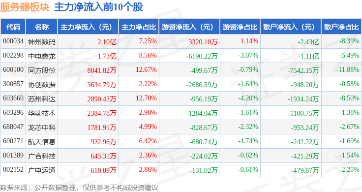从资金流向上来看,当日服务器板块主力资金净流出52.14亿元,游资资金净流入8.93亿元,散户资金净流入43.21亿元。服务器板块个股资金流向见下表: