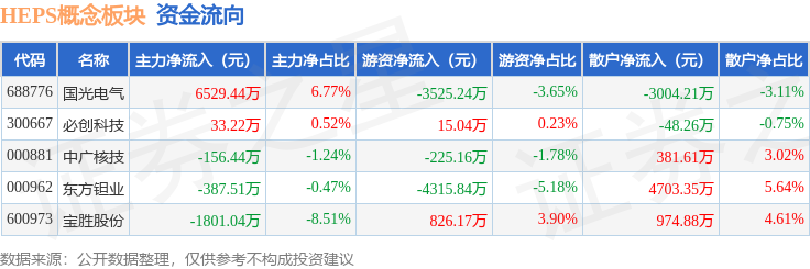 从资金流向上来看,当日HEPS概念板块主力资金净流入4217.66万元,游资资金净流出7225.03万元,散户资金净流入3007.37万元。HEPS概念板块个股资金流向见下表: