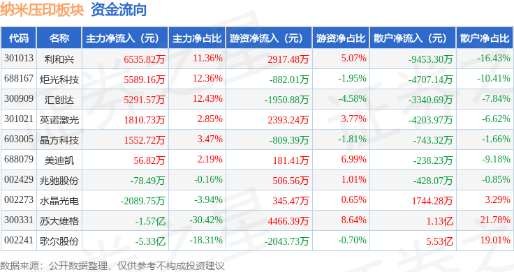 从资金流向上来看,当日纳米压印板块主力资金净流出5.03亿元,游资资金净流入5124.54万元,散户资金净流入4.52亿元。纳米压印板块个股资金流向见下表: