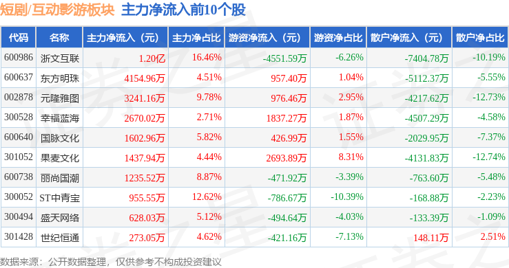 从资金流向上来看,当日短剧/互动影游板块主力资金净流出9.3亿元,游资资金净流出5099.09万元,散户资金净流入9.81亿元。短剧/互动影游板块个股资金流向见下表: