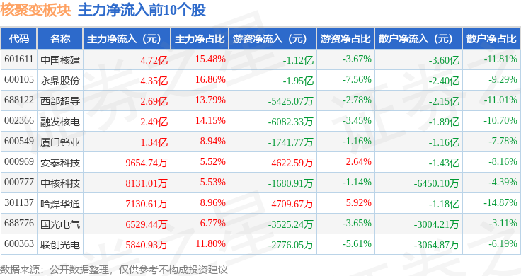 从资金流向上来看,当日核聚变板块主力资金净流入1.2亿元,游资资金净流入8717.24万元,散户资金净流出2.08亿元。核聚变板块个股资金流向见下表: