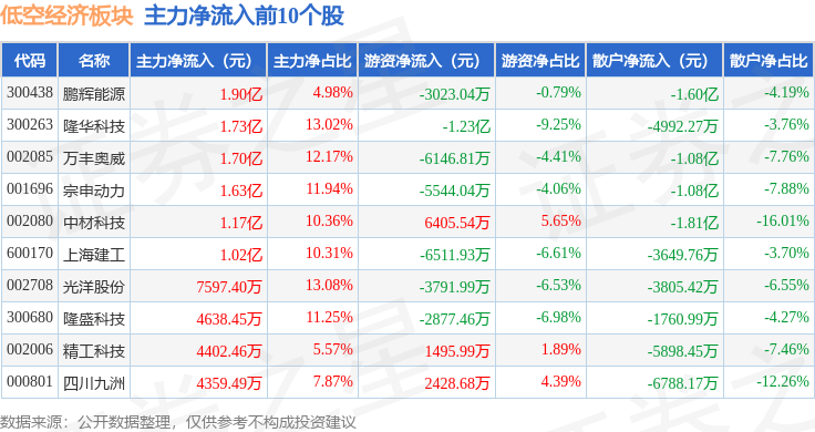 从资金流向上来看,当日低空经济板块主力资金净流出37.81亿元,游资资金净流入14.56亿元,散户资金净流入23.26亿元。低空经济板块个股资金流向见下表: