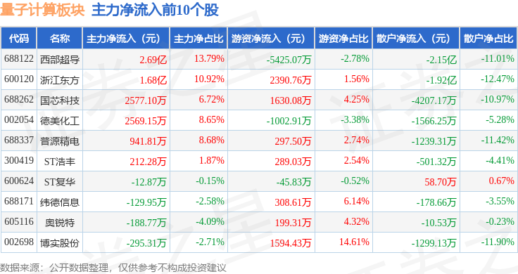 从资金流向上来看,当日量子计算板块主力资金净流出3.6亿元,游资资金净流入2.51亿元,散户资金净流入1.1亿元。量子计算板块个股资金流向见下表:
