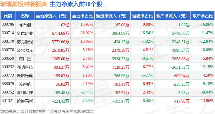 从资金流向上来看,当日玻璃基板封装板块主力资金净流出10.37亿元,游资资金净流入1.62亿元,散户资金净流入8.76亿元。玻璃基板封装板块个股资金流向见下表: