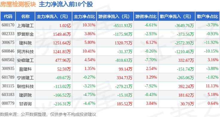 从资金流向上来看,当日房屋检测板块主力资金净流入5141.26万元,游资资金净流出4659.02万元,散户资金净流出482.24万元。房屋检测板块个股资金流向见下表: