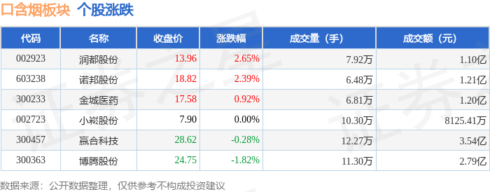 证券之星消息,11月11日口含烟板块较上一交易日下跌0.11%,博腾股份领跌。当日上证指数报收于4002.76,下跌0.39%。深证成指报收于13289.0,下跌1.03%。口含烟板块个股涨跌见下表: