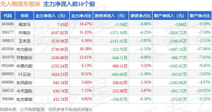从资金流向上来看,当日无人物流车板块主力资金净流入5.23亿元,游资资金净流出3.8亿元,散户资金净流出1.43亿元。无人物流车板块个股资金流向见下表: