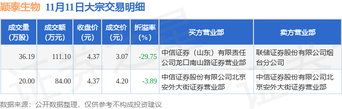 证券之星消息,11月11日颖泰生物发生大宗交易,交易数据如下: