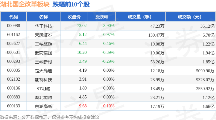 证券之星消息,11月11日湖北国企改革板块较上一交易日下跌0.82%,华工科技领跌。当日上证指数报收于4002.76,下跌0.39%。深证成指报收于13289.0,下跌1.03%。湖北国企改革板块个股涨跌见下表: