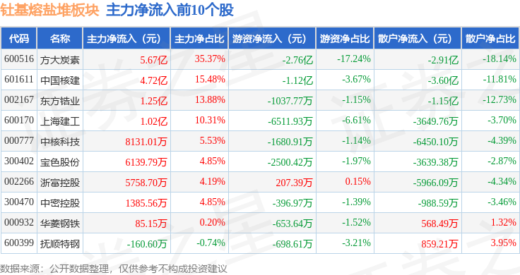 从资金流向上来看,当日钍基熔盐堆板块主力资金净流出426.4万元,游资资金净流出2.24亿元,散户资金净流入2.28亿元。钍基熔盐堆板块个股资金流向见下表: