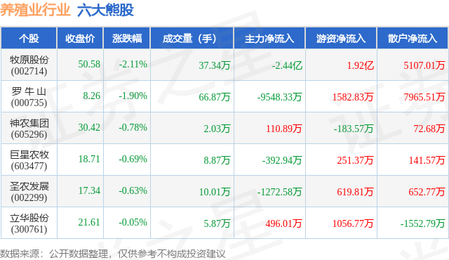 个股表现方面,养殖业行业当日领跌股为牧原股份(002714),该股当日报收50.58,下跌2.11%,成交量37.34万,主力资金净流出2.44亿元。罗 牛 山(000735)以下跌1.9%紧随其后,该股当日成交量66.87万,主力资金净流出9548.33万元。除此之外,神农集团(605296)、巨星农牧(603477)、圣农发展(002299)均进入当日熊股之列。具体个股列表见下表: