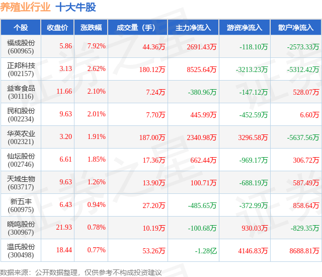 个股表现方面,养殖业行业当日领涨股为福成股份(600965),该股当日报收5.86,上涨7.92%,成交量44.36万,主力资金净流入2691.43万元。正邦科技(002157)以上涨2.62%紧随其后,该股当日成交量180.12万,主力资金净流入8525.64万元。除此之外,益客食品(301116)、民和股份(002234)、华英农业(002321)均进入当日牛股之列。具体个股列表见下表: