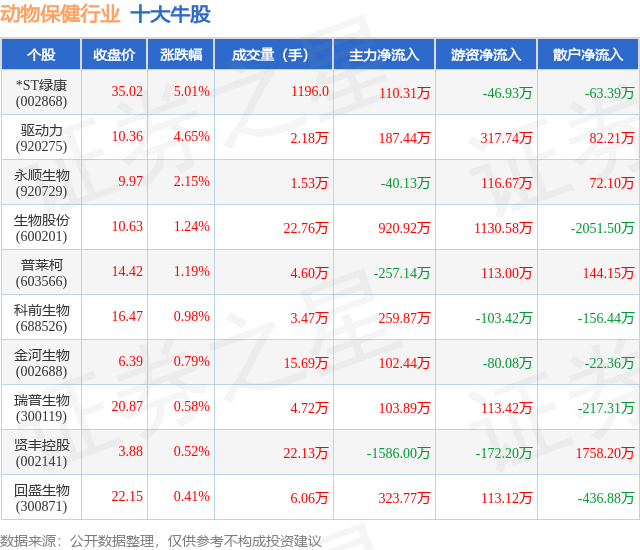 个股表现方面,动物保健行业当日领涨股为*ST绿康(002868),该股当日报收35.02,上涨5.01%,成交量1196.0,主力资金净流入110.31万元。驱动力(920275)以上涨4.65%紧随其后,该股当日成交量2.18万,主力资金净流入187.44万元。除此之外,永顺生物(920729)、生物股份(600201)、普莱柯(603566)均进入当日牛股之列。具体个股列表见下表: