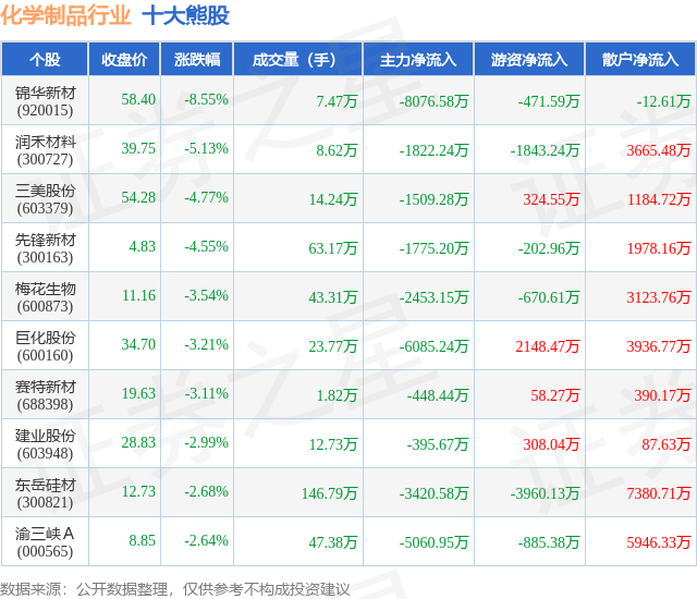 个股表现方面,化学制品行业当日领跌股为锦华新材(920015),该股当日报收58.4,下跌8.55%,成交量7.47万,主力资金净流出8076.58万元。润禾材料(300727)以下跌5.13%紧随其后,该股当日成交量8.62万,主力资金净流出1822.24万元。除此之外,三美股份(603379)、先锋新材(300163)、梅花生物(600873)均进入当日熊股之列。具体个股列表见下表: