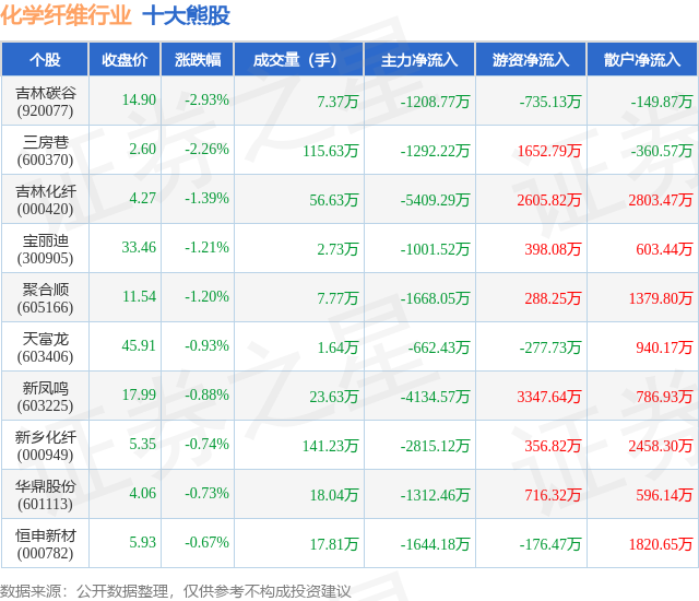 个股表现方面,化学纤维行业当日领跌股为吉林碳谷(920077),该股当日报收14.9,下跌2.93%,成交量7.37万,主力资金净流出1208.77万元。三房巷(600370)以下跌2.26%紧随其后,该股当日成交量115.63万,主力资金净流出1292.22万元。除此之外,吉林化纤(000420)、宝丽迪(300905)、聚合顺(605166)均进入当日熊股之列。具体个股列表见下表: