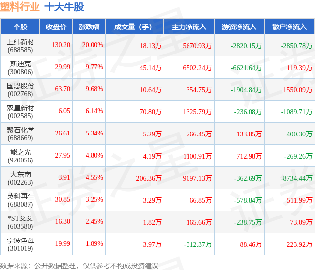 个股表现方面,塑料行业当日领涨股为上纬新材(688585),该股当日报收130.2,上涨20.0%,成交量18.13万,主力资金净流入5670.93万元。斯迪克(300806)以上涨9.77%紧随其后,该股当日成交量45.14万,主力资金净流入6502.24万元。除此之外,国恩股份(002768)、双星新材(002585)、聚石化学(688669)均进入当日牛股之列。具体个股列表见下表: