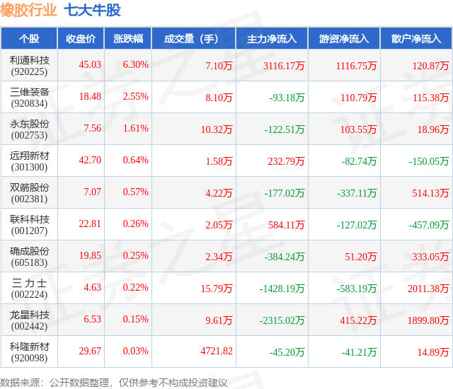 个股表现方面,橡胶行业当日领涨股为利通科技(920225),该股当日报收45.03,上涨6.3%,成交量7.1万,主力资金净流入3116.17万元。三维装备(920834)以上涨2.55%紧随其后,该股当日成交量8.1万,主力资金净流出93.18万元。除此之外,永东股份(002753)、远翔新材(301300)、双箭股份(002381)均进入当日牛股之列。具体个股列表见下表: